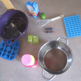 Ensuite, nous avons fait l'inventaire de ce dont nous disposions: gélatine, sucre, jus de pomme, colorant alimentaire bleu et rose et citron vert. Avions-nous tout ce qu'il nous fallait? Apparemment oui, par contre nous n'avions pas retenu les quantités...
